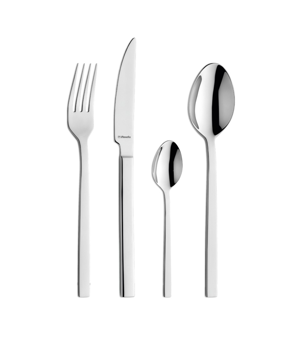 Ensemble de 24 couverts inox de la gamme Cube, livré en coffret. Des couverts haut de gamme en finition poli-miroir.Les modèles de la gamme Cube sont des couverts contemporains aux lignes droites et pures. La section carrée des manches leur confère un style urbain très actuel.Fort de près de 90 années d'expérience dans les arts de la table, les couverts du groupe Amefa se définissent par l'exigence de leur dessin et le soin apporté à leur fabrication. Amefa vise l'excellence en matière de qualité, de design et de prix.