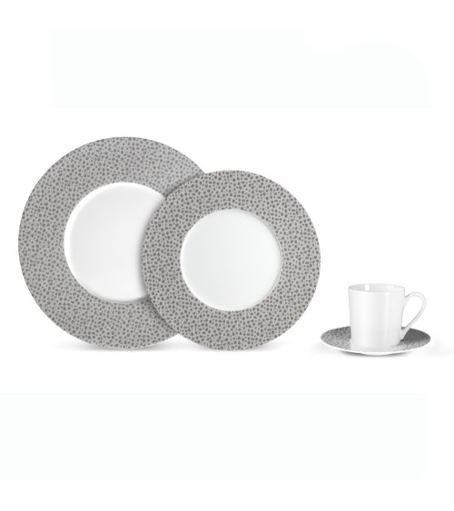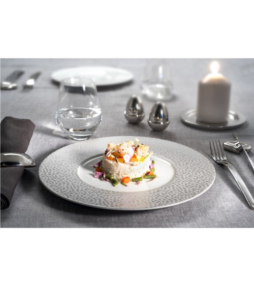 Produit à usages professionnels et particuliers.Baghera est une ligne de porcelaine fine décorée d'un subtil motif texturé pour une table urbaine et stylée. Les assiettes ont un style très actuel, avec des ailes planes et larges qui mettent le décor en valeur.Le décor, chic et contemporain, se décline en deux variantes couleur : platine ou blanc, que l'on peut alterner sur la table pour un résultat encore plus graphique. Les tasses café et thé sont blanches. On vient les associer à des soucoupes décorées.Originaire de Limoges, Médard de Noblat perpétue un savoir-faire et une tradition de qualité depuis 1836. Les formes, aux lignes fines et élégantes dégagent une personnalisé créant des tables expressives au fort pouvoir de séduction. Aussi précis que stylés, les décors habillent les porcelaines pour les sublimer.EntretienCompatible lave vaisselleCompatible micro-ondes