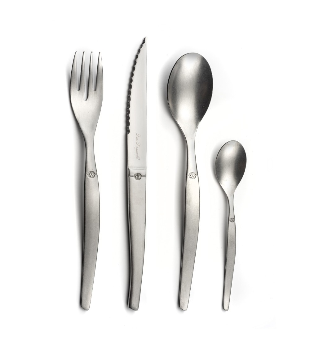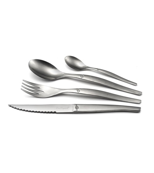 Ensemble de 24 couverts Laguiole pour 6 personnes de la gamme Jet. Couverts en acier inox en finition vieillie vintage. Lame micro-dentée pour une coupe optimale et un tranchant longue durée.Le Jet est laguiole de table au design contemporain, souligné par un poinçon d'abeille moderne et stylisé. Le Jet se décline ici dans une finition vieillie vintage, à la façon de vieux couverts chinés dans une brocante. Un mix réussi de tradition et de tendance.Lou Laguiole® allie la force de la Tradition et l'élégance de la Modernité. Notre gamme de couteaux Laguiole est la garantie d'une signature raffinée pour des tables authentiques au quotidien. Lou Laguiole® est une marque déposée et distribuée exclusivement par Amefa en France et dans le monde.