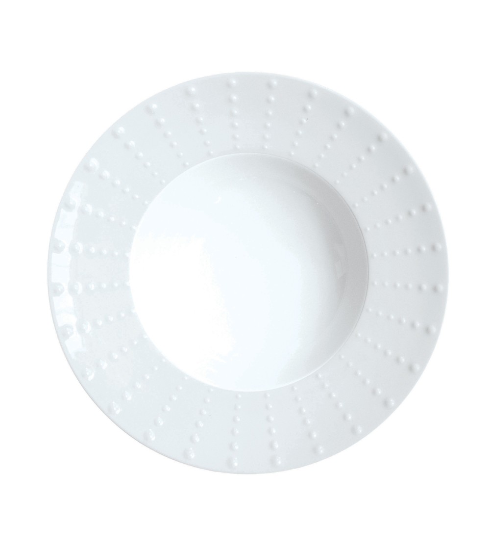 La collection Sania Blanc se destine à une table haut de gamme, intemporelle et lumineuse. Elle est en porcelaine fine émaillée blanche, gravée en relief sur une forme ronde avec aile. Différentes gravures se mixent pour donner à l'ensemble vie et modernité.La richesse du décor inspiré de la nature reprend les reliefs d'oursins et de coquillages dont les billes diffèrent selon les pièces.Originaire de Limoges, Médard de Noblat perpétue un savoir-faire et une tradition de qualité depuis 1836. Les formes, aux lignes fines et élégantes dégagent une personnalisé créant des tables expressives au fort pouvoir de séduction. Aussi précis que stylés, les décors habillent les porcelaines pour les sublimer.