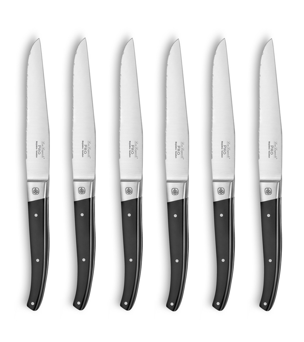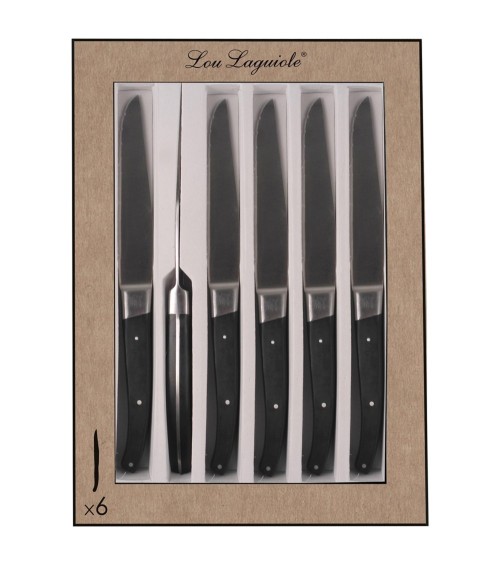 [Coffrets de 6 couteaux steak de la gamme Lou Laguiole Pro. Lame microdentée 11.5cm en acier haute performance MoV - Molybdène Vanadium. Manche en ABS noir. Montage pleine soie avec rivets et mitre en acier inox. La collection Pro de Lou Laguiole est une