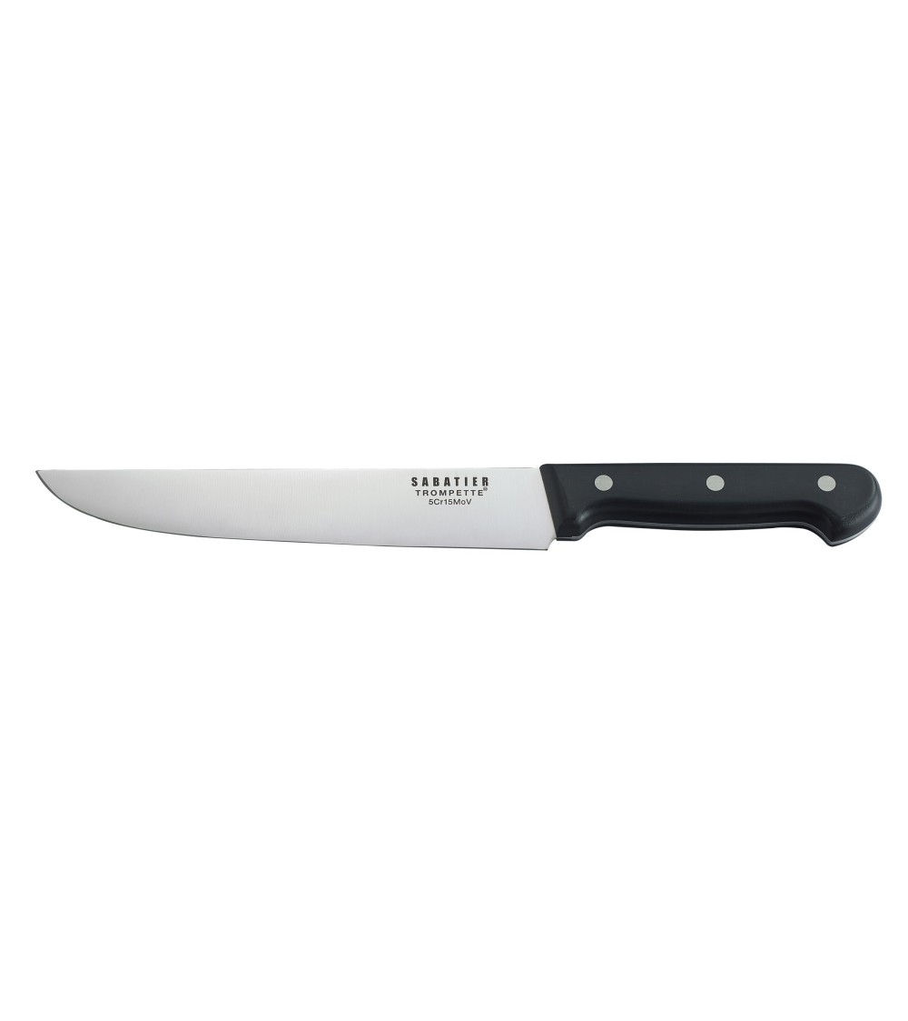Produit à usages professionnels et particuliers.Couteau filet de boucher de la gamme Universal. Lame 20cm en acier haute performance MoV - Molybdène Vanadium. Le dos de lame est arrondi, pour un confort de coupe optimal. Le fil de la lame est poli au cuir pour un tranchant rasoir. Les rivets et la soie sont en acier inox 18/0. Nous recommandons d'essuyer le couteau après lavage - machine ou main - pour en prolonger indéfiniment l'usage.La collection Universal est une gamme incontournable de la coutellerie professionnelle, qui se décline sur 14 modèles. Design classique, avec un manche pourvu d'une garde avant et arrière. Ces couteaux sont montés avec 3 rivets traversants qui garantissent une solidité à toute épreuve.La marque Sabatier Trompette est née au début du 18ème siècle dans le bassin de Thiers, capitale de la coutellerie en France. Les gammes de couteaux de la marque Sabatier Trompette répondent aux usages spécifiques de la préparation culinaire. Forme de la lame, ergonomie du manche, faible poids et parfait équilibre sont étudiés afin d?obtenir des outils parfaits pour les Chefs amateurs ou confirmés.Entretien :Compatible lave vaisselle