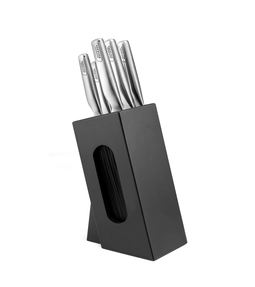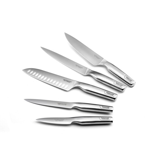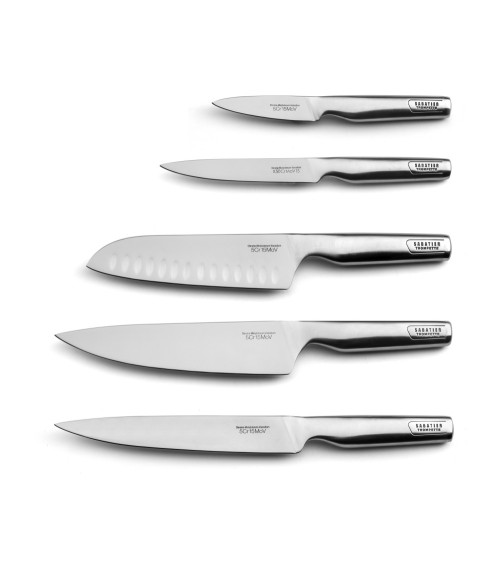 Bloc magnétique garni de 5 couteaux : Office 9cm, Utile 13cm, Santoku 17cm, Découper flexible 20cm et Chef 20cm de la gamme Asean. Lame en acier haute performance MoV - Molybdène Vanadium. Dos de lame arrondi pour un confort de coupe optimal. Le fil de la lame est poli au cuir pour un tranchant rasoir.La collection Asean se décline sur 6 modèles d'inspiration japonaise. 100% acier, les couteaux de cuisine Asean ont une résistance à toute épreuve. Faciles à nettoyer, leur fluidité en fait des outils sains, antibactériens, adaptés à un usage quotidien.Les couteaux de Chef Sabatier Trompette ont été développés pour répondre aux exigences spécifiques de la préparation culinaire. Les lames des couteaux sont en acier inoxydable Molybdène vanadium de grande qualité avec un pourcentage élevé de carbone. Ces aciers confèrent aux produits leurs qualités de résistance, dureté, inoxydabilité, anti-corrosion et tranchant.