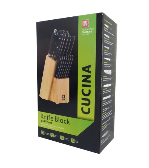 Bloc 15 pièces en bois de la collection Cuccina. Lame avec évidage de la meilleure qualité d?acier inoxydable, possédant un tranchant biseauté concave de chaque côté pour une coupe plus fine.La gamme Cucina a été conçue pour satisfaire les exigences d'une cuisine multifonctionnelle. Chaque bloc rassemble les essentiels pour un usage au quotidien.Expert coutelier depuis 1839, Richardson Sheffield s'est forgé une réputation sans précédent, en devenant l'un des leaders de la coutellerie au Royaume-Uni. Les couteaux permettent de satisfaire les passionnés d'arts culinaires, professionnels ou amateurs. Innovante, la marque Richardson Sheffield développe en permanence de nouveaux couteaux issus des meilleures technologies.