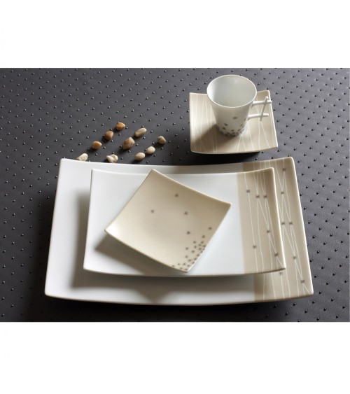 Chic, zen et contemporaine, la gamme Oxygène Étoiles décline une forme exclusive signée Médard de Noblat qui exprime à la fois modernité et simplicité. Sa ligne pure et élégante est d'inspiration asiatique, avec des lignes entrecoupées d'étoiles platines.Les angles vifs et la silhouette envolée en font une forme exclusive, qui mèle l'émail au décor étoilé. Les pièces sont massives et graphiques. Originaire de Limoges, Médard de Noblat perpétue un savoir-faire et une tradition de qualité depuis 1836. Nos porcelaines créent des univers actuels et raffinés, entre rigueur et exubérance, pour un quotidien hors norme.