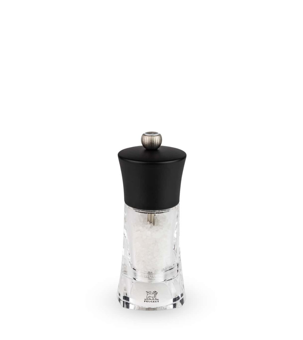 Le moulin à sel Oléron noir est un classique de la gamme Peugeot. Son corps transparent en acryl, légèrement torsadé, laisse apparaitre les cristaux de sel qu'il contient. Sa tête en bois est surmontée d'un bouton permettant d'ajuster simplement la taille de mouture du sel.