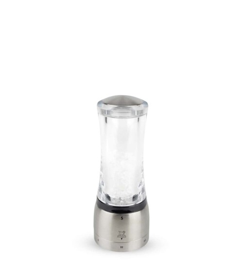 Le moulin à sel daman 16 cm est un moulin dont la conception innovante à permis de supprimer l'axe central vertical pour laisser apparaitre le sel qui le compose. Un parti pris à la fois esthétique et pratique. Tout en transparence, le moulin à sel Peugeot de la collection Daman s'est allégé de son axe central pour laisser pleinement apparaitre les cristaux de sels qui le compose. Son design épuré associe de manière élégante la transparence de l'acryl à l'éclat unique de l'inox. Il est doté d'un système breveté de réglage de mouture appelé u'Select qui permet de varier les saveurs en sélectionnant une taille mouture de sel parmi les 6 sélections possibles. Comme tous les moulins Peugeot, son mécanisme à sel en acier est garanti sans limitation de durée.