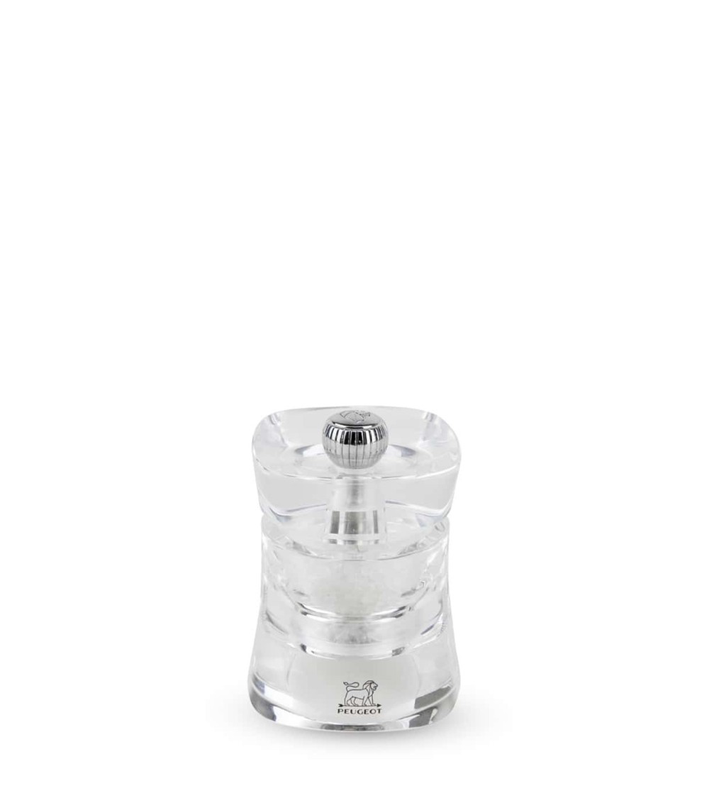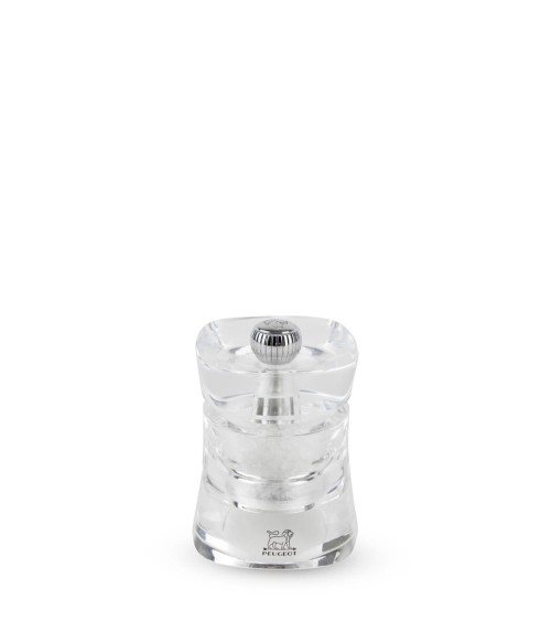 Le moulin à sel Peugeot Baltic en acryl, totalement transparent, sublime les cristaux de sels qu'il contient Jeux de transparence avec le moulin à sel Peugeot Baltic. Fabriqué en acryl, ce moulin à sel est un joli écrin pour les sels qu'il contient dont les cristaux visibles brillent naturellement. Avec ces 8 cm, il tient parfaitement dans la main. Sa tête évasée et creusée abrite en son centre un bouton en inox brillant. Il permet de régler la mouture du sel (vissez légèrement la vis pour obtenir un sel plus fin) : ce moulin manuel est doté du mécanisme à sel en acier Peugeot garanti sans limitation de durée. Un modèle ultra-séduisant à marier sur la table avec son moulin à poivre pour un duo parfait.