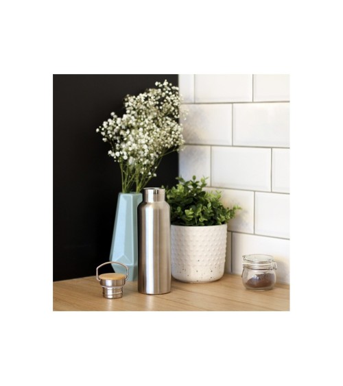 Bouteille inox isothermeDouble paroiCapacité 500 mlBouchon inox et bambouMaintien des boissons chaudes jusquà 6 heures et fraîches jusquà 12 heures