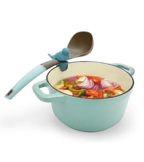 Ce petit oiseau craquant va devenir l'objet incontournable de votre cuisine. 3en1, il permet de laisser votre cuillère sur le rebord de votre casserole proprement et de ne plus salir votre plan de travail. Avec ses différentes entailles, il peut également maintenir un couvercle ouvert pendant votre cuisson ou vous servir de pince lorsque vous voulez attraper un plat trop chaud! Entièrement en silicone premium, il supporte des températures allant de -40 à 220°C et se lave au lave vaisselle! Il existe également en blanc et gris.