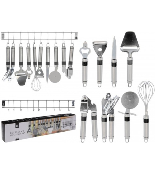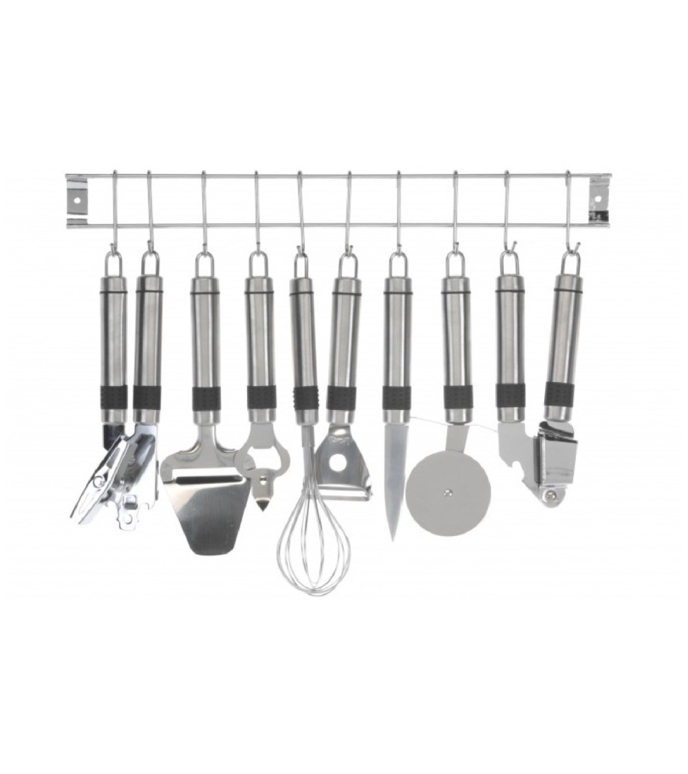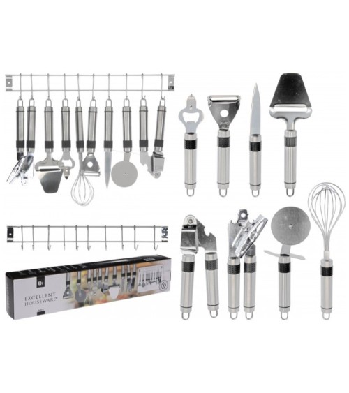 Set de 8 ustensiles de cuisine en acier inoxydable avec support mural et crochets. Couleur: Inox - Matière: Acier Inoxydable - Dimensions: Longueur 43cm