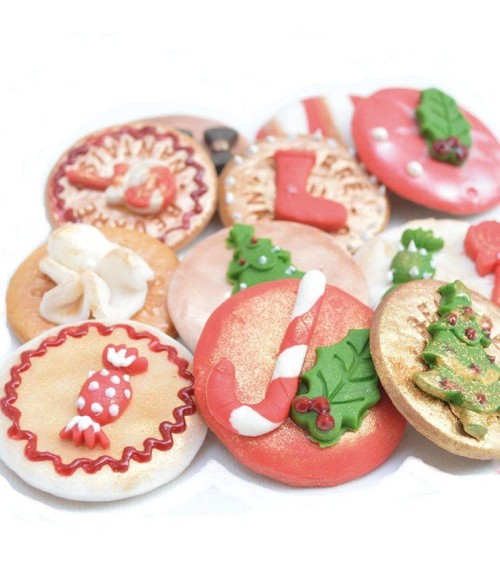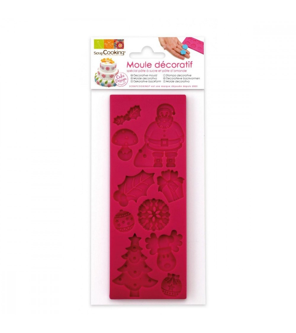 Moule à pâtisserie en silicone Noël Idéal pour personnaliser et créer des décors de Noël uniques originaux sur vos cupcakes et autres gâteaux. Pratique et facile d'entretien, ce moule en silicone rose ScrapCooking® est spécialement conçut pour confectionner 10 décors sucrés rappelant la féerie de Noel (feuille de houx, cerf, sapin...et l'indétrônable Père-Noel). Pratique, il est facile à manipuler pour les plus petits comme pour les plus grands. Effet garanti! Dimensions : 16 x 6 x 0,8 cm Pour des décorations aux couleurs de Noël, découvrez notre pâte d'amande Noël !