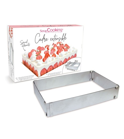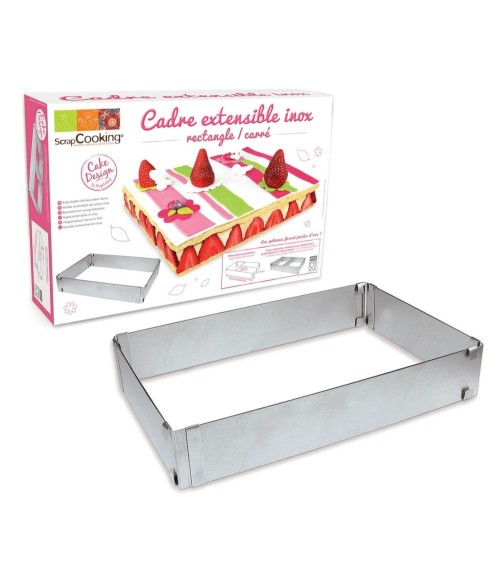 Pour tous les amateurs de pâtisserie et professionnels, le cadre extensible de ScrapCooking rectangulaire vous permettra de confectionner tous vos idées de gâteaux et génoises à la taille que vous souhaitez. Désormais vous pourrez confectionner toutes sortes de gâteaux, que ce soit au four, au réfrégirateur et même au congélateur sans risque d'abimer votre matériel de pâtisserie. Extensible, il est ainsi plus facile de démouler votre préparation. Le pack du cadre extensible rectangle de ScrapCooking contient un séparateur qui vous permet de doser ainsi facilement la taille désirée de vos entremets, dacquoise et autres pâtisseries. Vous évitez également d'accumuler dans vos placards de nombreux cadres à pâtisserie de taille différente. Une alternative donc très pratique et économique. Dimensions : min 27 x 18 cm, max 52 x 34 cm  5 cm de hauteur Pour le nettoyer, il vous suffit de le rincer sous l'eau.