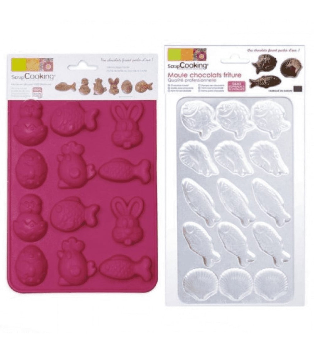 Coffret de 2 moules : 1 en plastique dur pour réaliser les fameuses fritures en chocolat et 1 en silicone pour réaliser des chocolat de Pâques : poissons, lapins, poussins, oeufs et petites poules... Dimensions du moule friture en tritan : 200 x 110 x 2 mm Dimensions du moule en silicone : 20,4 x 14,4 x 1 cm.