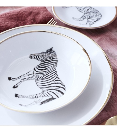 J'ai écouté ma grand-mère me raconter l'histoire du petit moine espion français qui a apporté le secret de la porcelaine chinoise en Europe : au début du XVIIIe siècle, un moine jésuite français vivant en Chine a étudié les secrets de sa porcelaine exquise, l'alchimie de l'eau, du feu et de la terre, et a transmis les informations dans des lettres détaillées à sa France natale. L'utilisation de l'argile blanche semblait indispensable dans l'équation, ce que les Français n'avaient pas. Lorsque, en 1767, un gisement de kaolin a été découvert à Saint Yrieix la Perche, près de Limoges, cette argile blanche tant convoitée, la riche histoire de la porcelaine française par excellence a commencé. Assiete Creuse en porcelaine de Limoges avec un motif zébré.Bordure dorée peinte à la main. Conception exclusive par Lo de Manuela . Grande résistance et durabilité. Made in France, Limoges