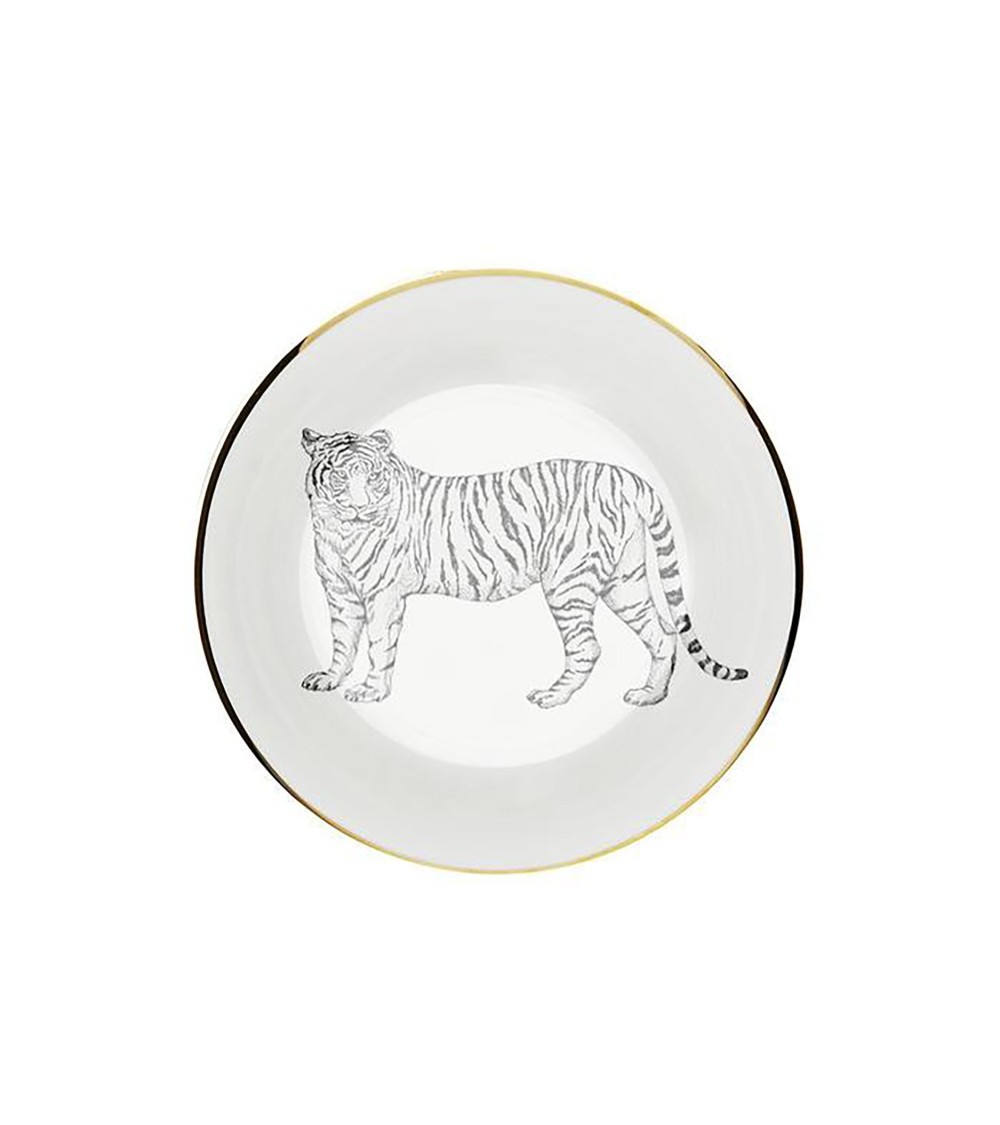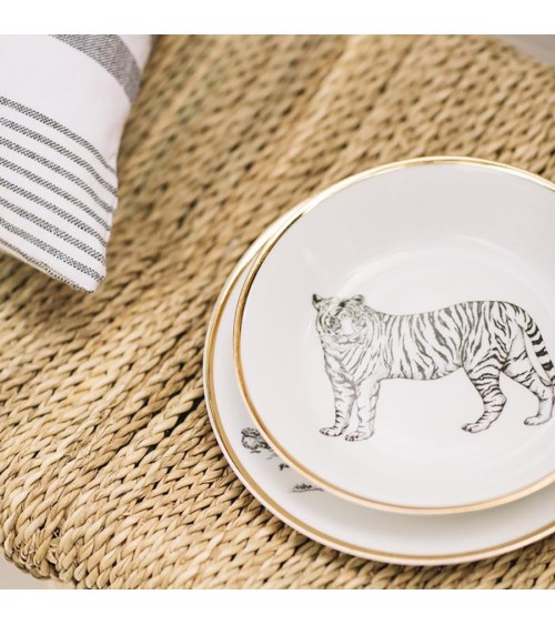 J'ai écouté ma grand-mère me raconter l'histoire du petit moine espion français qui a apporté le secret de la porcelaine chinoise en Europe : au début du XVIIIe siècle, un moine jésuite français vivant en Chine a étudié les secrets de sa porcelaine exquise, l'alchimie de l'eau, du feu et de la terre, et a transmis les informations dans des lettres détaillées à sa France natale. L'utilisation de l'argile blanche semblait indispensable dans l'équation, ce que les Français n'avaient pas. Lorsque, en 1767, un gisement de kaolin a été découvert à Saint Yrieix la Perche, près de Limoges, cette argile blanche tant convoitée, la riche histoire de la porcelaine française par excellence a commencé. Assiete Creuse en porcelaine de Limoges avec un motif Tigre.Bordure dorée peinte à la main. Conception exclusive par Lo de Manuela . Grande résistance et durabilité. Made in France, Limoges