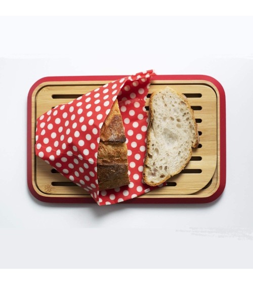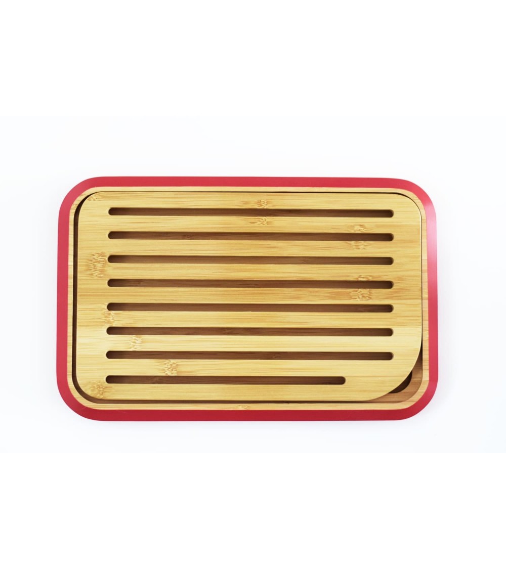 Petite planche à pain de table en bambou - Bord coloré rouge - Pieds antidérapants en silicone - Grille amovible pour récupérer les miettes - Encoche pour soulever facilement la grille - Idéale pour couper et servir à table ! - Micro-ondes : Non - Lave-vaisselle : Non