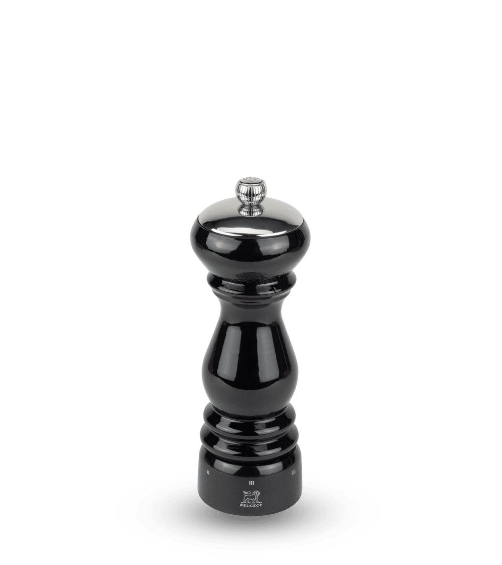 Le moulin à sel Paris icone laqué noir 18 cm revisite dans une version contemporaine le traditionnel moulin Paris, modèle le plus emblématique de Peugeot crée en 1987. Le corps laqué noir de ce moulin à sel manuel est surmonté d'une sublime coupelle en inox brillante. Un mariage raffiné et ultra tendance que vous aurez plaisir à exposer en décoration de table. Avec le moulin à sel Paris icone, le modèle Paris, référence incontestée du moulin, tant chez les chefs que les amateurs de cuisine, est ici revisité dans une version contemporaine. Le moulin à sel manuel en bois Paris icone 18 cm se dévoile dans un coloris laqué noir étincelant, très sophistiqué. Sous son apparence très élégante se cache toute la performance et l'ingéniosité de la mécanique Peugeot. En effet, ce moulin à sel se dote d'un mécanisme à sel en acier garanti sans limite de durée ainsi que d'un  ingénieux système breveté de réglage de mouture qui permet d'ajuster d'un simple geste et en quelques seconde la taille de la mouture du sel. Positionnez la mouture sur 1 pour obtenir un sel très fin et sur 6 pour un sel moulu grossièrement.  Lumineux, prestigieux, ce moulin est un véritable objet de décoration qui ajoutera une touche contemporaine à vos tables.