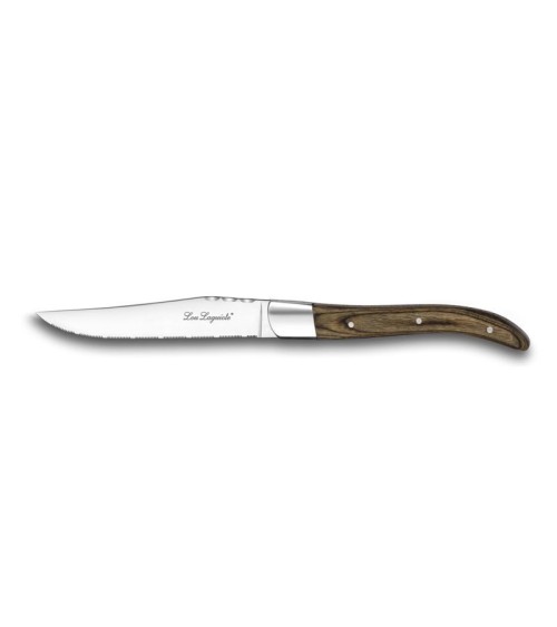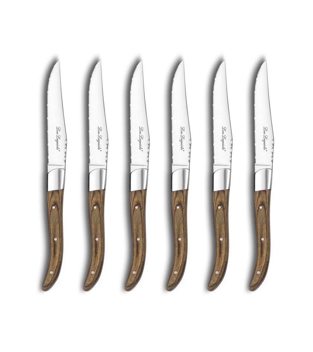 Coffret de 6 couteaux steak Laguiole de la gamme Louis. Les 6 manches sont en bois de pakka coloris noyer. Mitre en acier massif. Lame pleine soie en acier inoxydable mini-dentée. Dessus de lame guilloché. Un design traditionnel pour une coupe optimale.Les couteaux steaks de la gamme Louis sont l'essence des couteaux Laguiole, avec une mitre inox et un manche en bois assorti. Ces couteaux sont dotés d'une lame pleine soie et d'un montage rivets en inox.Lou Laguiole® signe un design exclusif et traditionnel. Pour concevoir cette authentique gamme de couteaux Laguiole, nous mobilisons tout notre savoir-faire coutelier. Lou Laguiole® est une marque déposée et distribuée exclusivement par Amefa en France et dans le monde.