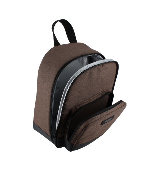 Sac à dos isotherme 7L pour le dejeuner nomade. 3heures de conservation (norme EN 12546-2) 32°C. Durée pouvant être allongé en utilisant un accumulateur de froid. Poche zippée Mousse isolante haute densité Doublure en PEVA gris étanche et facile à nettoyer dotée de la protection anti-bactérienne Microban® Poche extérieure zippée et bretelles ajustables Poignée de portage Tissu 300x300D polyester brun chinéNettoyage à la main conseillé