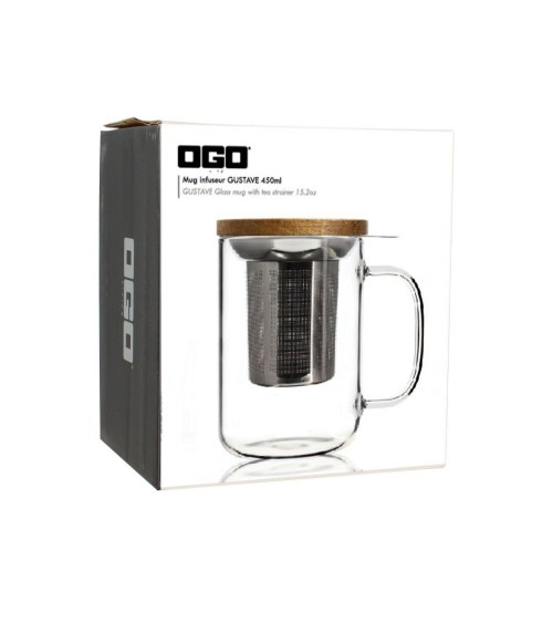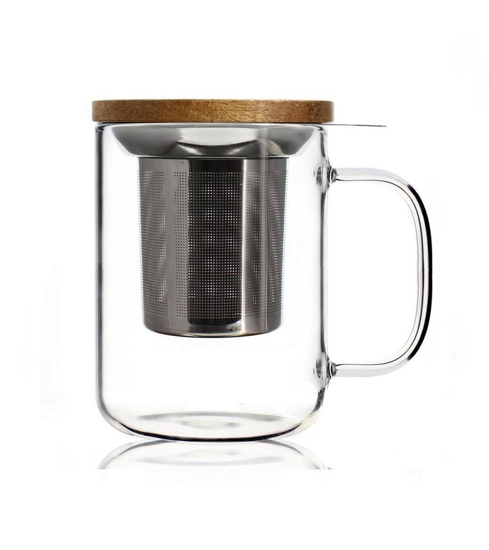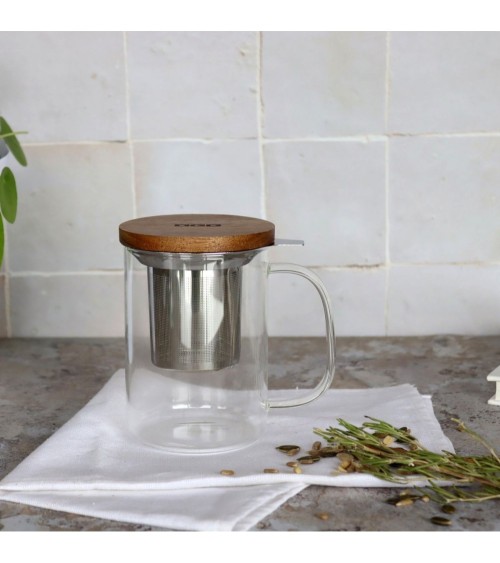 Produits à usages professionnels et particuliers. Mug infuser en verre, idéal pour les thés et infusions. Doté d'un filtre en acier inoxydable aux tamis fins pour garantir une parfaite infusion. Avec ses lignes épurées et son couvercle en bois contrastant, cette tasse est tès moderne. Composée de verre borosilicate, cette tisanière est résistante à la chaleur et aux cchocs themiques. Contenance 450mlPratique : compatible avec le lave-vaisselle (hors couvercle)