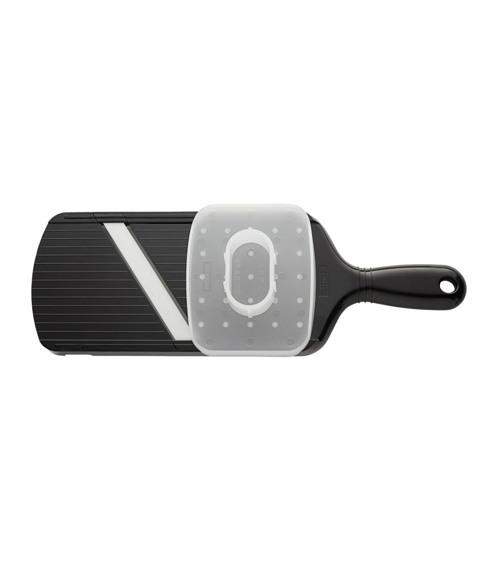 Mandoline réglable (4 épaisseurs de coupe) en céramique avec bloc protège doigts. - Micro-ondes : Non - Lave-vaisselle : Oui