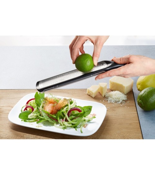 Parmesan, gingembre, chocolat, zeste de citron, écorce de cannelle et autres aliments fermes : les lames extrêmement acérées de la râpe fine LASER CUT permettent de râper facilement et d'obtenir un résultat des plus raffinés !- Râpe longue et concave pour râper rapidement, efficacement et sûrement.- Lames LASER CUT extrêmement acérées- Etui de protection transparent, réservoir collecteur avec déversement ciblé- Pied antidérapant- ?illet de suspensionGarantie : 5 ansMatière principale : Acier inoxydable de haute qualité