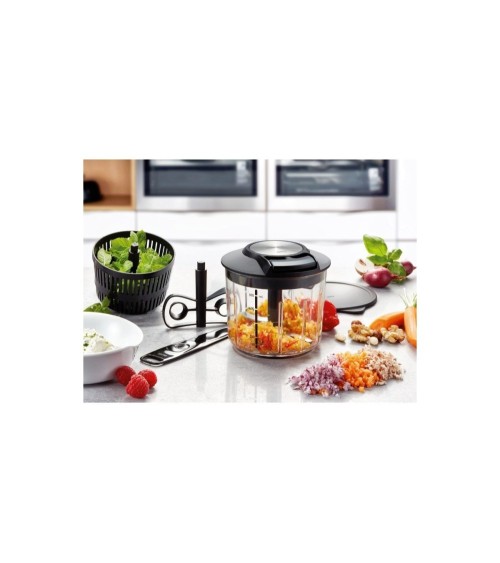 Utilisation polyvalente et sans électricité : ce talent multiple hache fruits et légumes, noix, oignons ou poisson, il brasse et mélange aussi bien le dip que le dessert et réalise également l'essorage à sec d'herbes aromatiques.- Utilisation efficace et simple grâce au mécanisme manuel- Fil de traction ergonomique- Eléments de coupe avec deux lames recourbées en acier japonais et racloirs intégrés- Panier indéformable- Elément de mélange- Couvercle de conservation et raclette inclus- Changement facile des éléments- Antidérapant grâce au cercle du fond en plastique- Capuchons de protection pour les lames- Graduation: ml / cups / fl. oz- Volume de remplissage : 800 ml- Tous les elements sont lavables en machine excepte le couvercle avec le mecanisme a cordelette. Respecter les instructions de nettoyage.Garantie : 20 ansMatière principale : Lame en acier japonais
