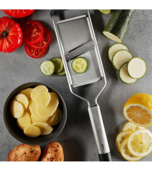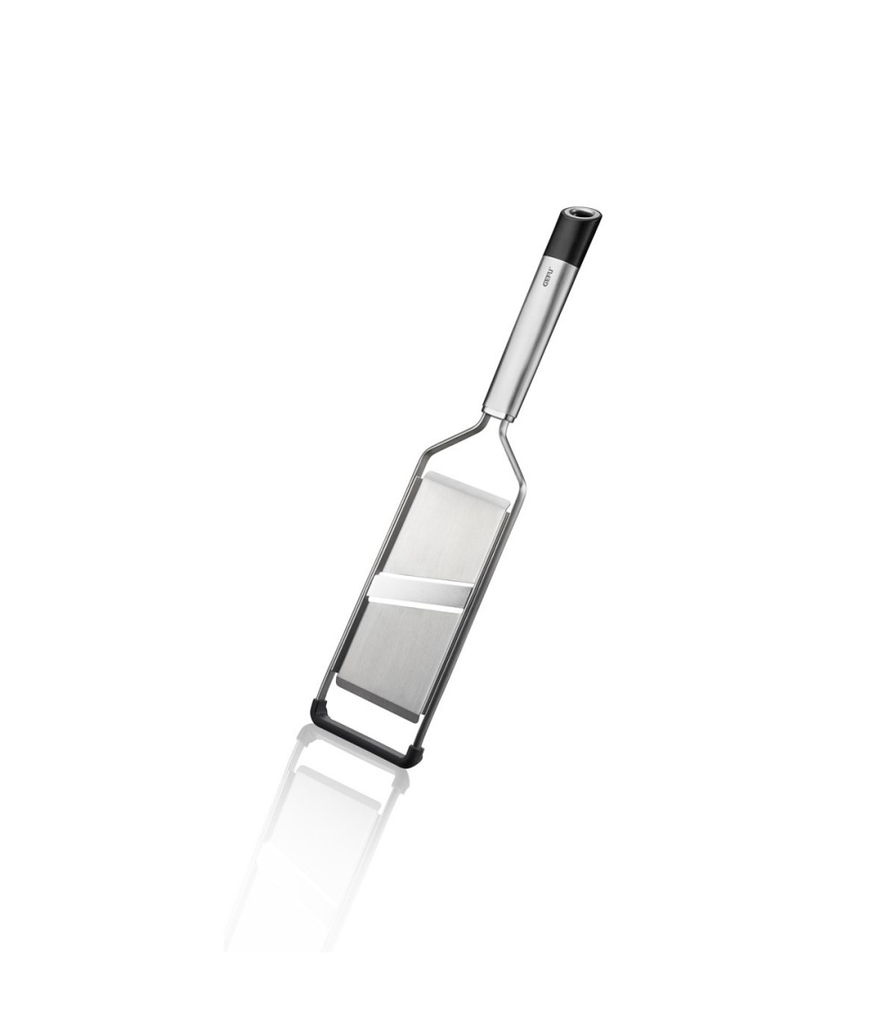 La lame de la mandoline affilée de chaque côté réalise rapidement et efficacement des rondelles de pommes de terre, de légumes et de fruits pour salades, gratins et garniture de gâteaux.- Lame extrêmement tranchante, affilée des deux côtés- Pied antidérapant- Poignée de forme ergonomique- Capuchon de protection inclusGarantie : 20 ansMatière principale : Acier inoxydable de haute qualité
