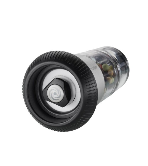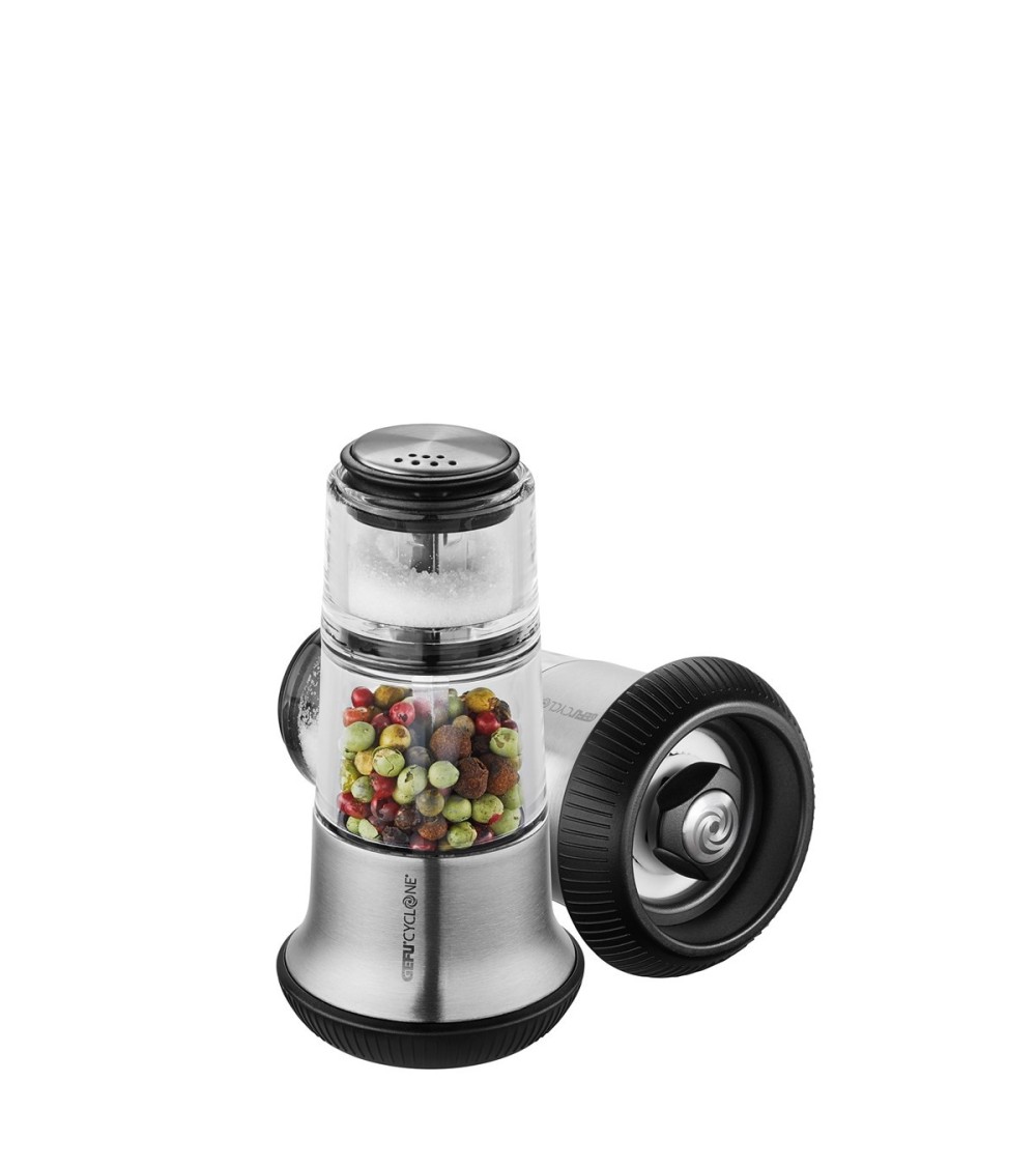 Ce double talent pratique transforme la manière classique d'assaisonner et donne une excellente impression sur n'importe quelle table. Le sel se trouve dans la partie supérieure du récipient à épices facilement rechargeable, les grains de poivre dans la partie inférieure. Le moulin à poivre est équipé du broyeur de précision CYCLONE® facilement maniable et réglable en continu. C'est ainsi que rectifier l'assaisonnement conjugue élégance et efficacité !- Broyeur à cône céramique de haute qualité CYCLONE® pour une précision et une efficacité maximales- Réglage en continu du degré de mouture : résultat très fin à très grossier- Salière intégrée- Récipient à épices facile à remplirGarantie : 20 ansMatière principale : Acier inoxydable de haute qualité
