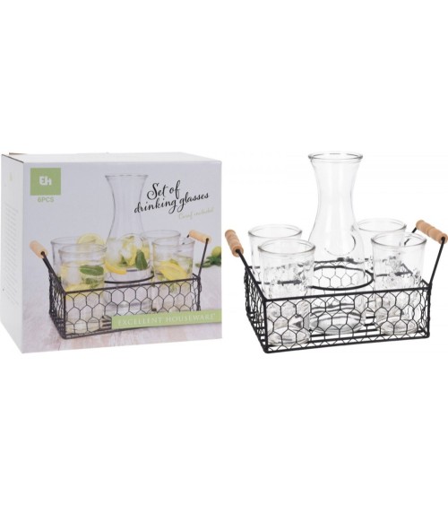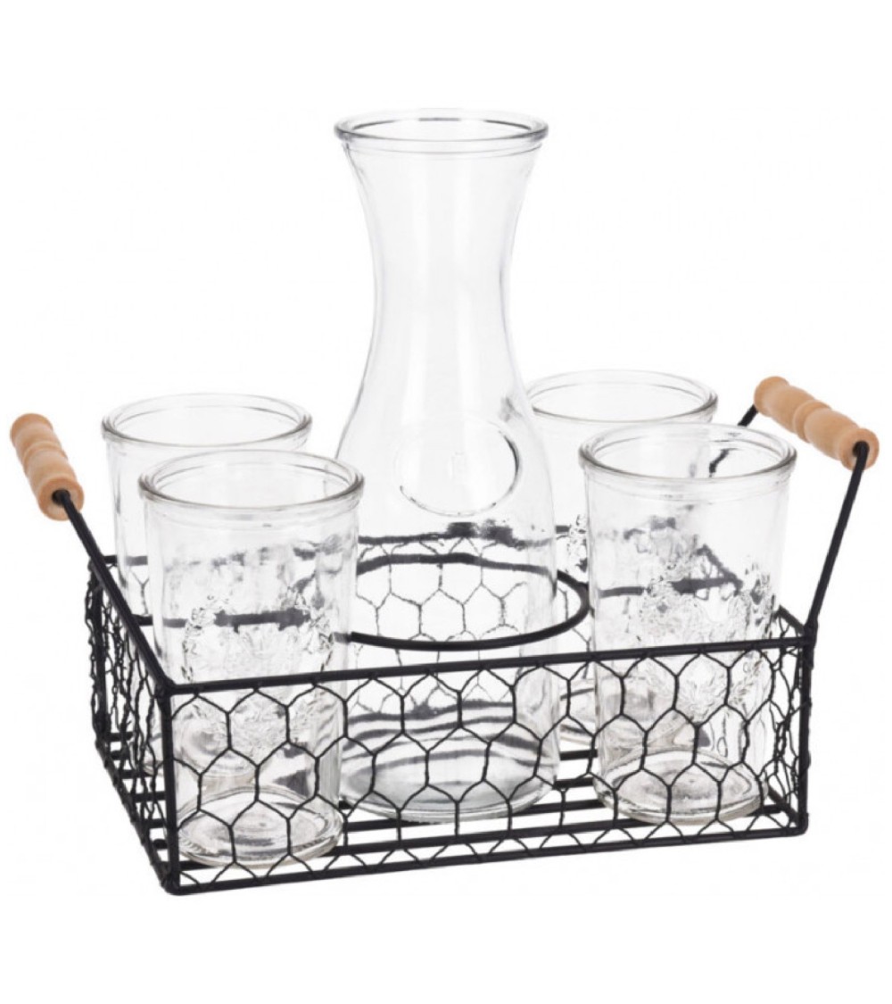 Coffret comprenant 6 pièces: 1 carafe de 1L, 4 verres assortis et un support en métal avec poignées bois. Contenance Carafe: 1L.Dimensions Verres: 15x8.5cmDimensions Carafe: 27x10.5cmDimensions Support:25x17cmCouleur: Transparent et MétalMatière: Verre et Métal