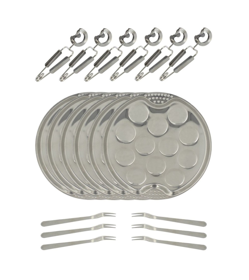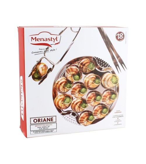 Ce service 18 pièces est idéal pour déguster facilement tous types d'escargots. A offrir ou pour se faire plaisir,c'est un incontournable pour les fins gourmets. Il se compose de 6 assiettes de 19cm de diamètre pour y déposer 12 escargots. Il y a également 6 pinces et 6 fourchettes à escargots. Conçu à partir d'acier inoxydable, ce service est robuste et pratique à utiliser Les couverts sont ergonomiques ce qui garantit un meilleur confort en main Ce service est composé de 6 assiettes à 12 escargots, 6 pinces ainsi que 6 fourchettes Ce service à escargots Menastyl est idéal pour passer de bonnes fêtes de fin d'année Compatible lave-vaisselle et micro-ondes