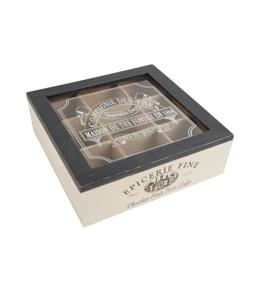 Aspect : Matériau principal : BoisMatériaux secondaires : VerreDimensions : Hauteur (en cm) : 8,00Longueur (en cm) : 24,00Profondeur (en cm) : 24,00Autres caractéristiques : Livré monté : OuiPoids (en kg) : 0,88 Façonné pour s'harmoniser avec son contenu, la boite à thé 9 compartiments conjugue subtilement la couleur noire au marron...