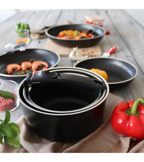 fournie avec poignée amovible en bakélite et insert silicone,vous permet de passer d'un ustensile à l'autre,de la plaque au four en toute simplicité et sécurité avec un rangement optimal. Corps aluminium fond en acier inoxydable pour une répartition optimium de la chaleur. Avec une épaissseur de 2.5mm et un revêtement anti-adhésif haute résistance,cette gamme mobile est tous feux dont induction. Made in France Ce lot est composé de 3 tailles différentes : 16,18 et 20cm avec poignée incluse Poignée en bakélite et silicone Fond renforcé en acier inoxydable pour une répartition optimale de la chaleur Compatible lave vaisselle