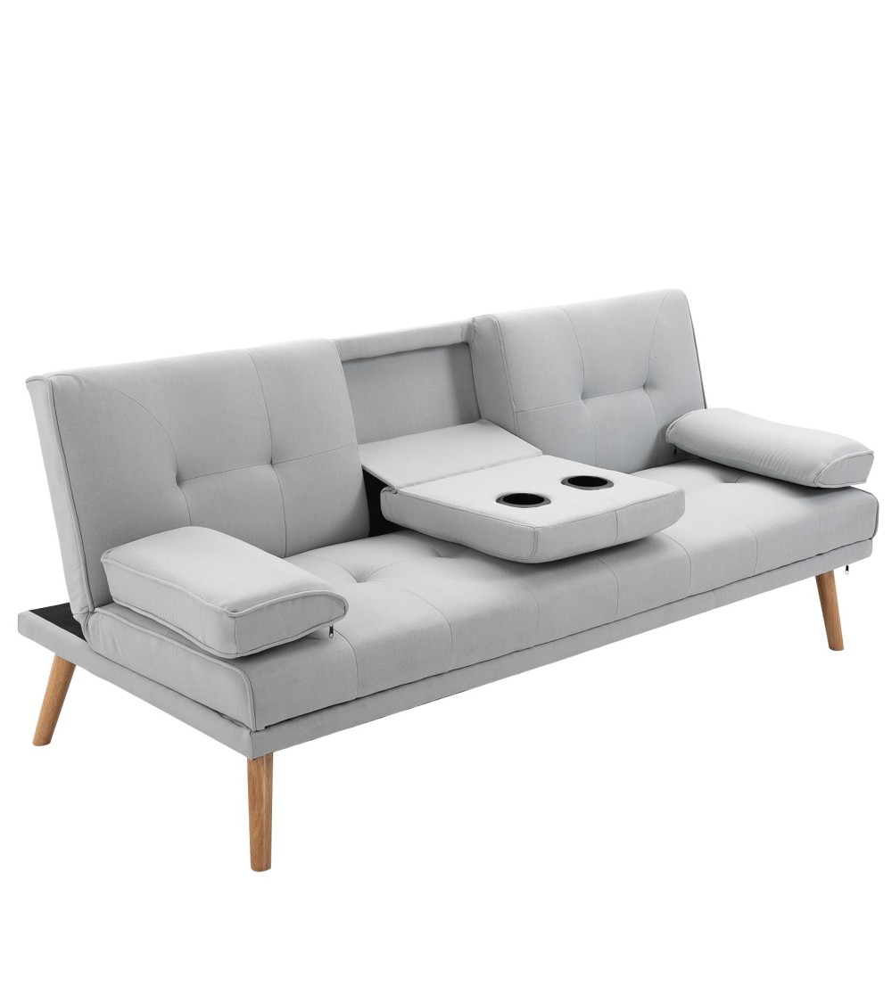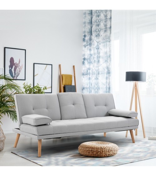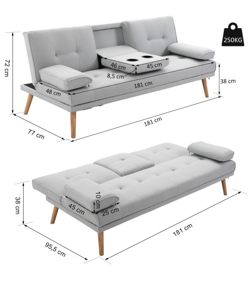 Caractéristiques : - Canapé convertible 3 places design scandinave pour ajouter une touche supplémentaire d'élégance à votre intérieur- Lignes épurées, pieds effilés en bois pour une parfaite intégration dans l'espace intérieur de votre choix : salon, bureau, chambre, salle de jeu, etc...- Dossier et assise avec larges capitons boutons pour plus de raffinement- Dossier inclinable à 3 positions, idéal pour s'adapter à toutes les situations : regarder la TV, lire, se reposer, etc...- Accoudoirs amovibles vous offrant une plus grande surface d'assise si besoin- Revêtement en tissu de lin très perméable à l'air et donc très agréable au toucher par n'importe quelle condition : chaleur ou fraicheur- Rembourrage mousse haute densité, épaisseur de 18 cm au niveau de l'assise et 12,5 cm au niveau du dossier- Châssis et pieds en bois massif de caoutchouc : maximum de stabilité et utilisation grand confort à long terme- Poids total maximum recommandé de 250 Kg- Montage facile grâce au manuel d'instructions illustré fourni Spécifications : - Couleurs principales : gris clair, bois massif clair- Matériaux principaux : tissu de lin, bois massif de caoutchouc et mousse (garnissage)- Dim. canapé : 181L x 77l x 72H cm- Dim. lit : 181L x 95,5l x 38H cm- Largeur assise : 181 cm (épaisseur : 18 cm)- Profondeur assise : 48 cm- Hauteur assise : 38 cm- Hauteur dossier : 43 cm (épaisseur : 12,5 cm)- Inclinaison dossier : 115°, 145°, 180°- Dim. table basse : 45l x 46H cm (épaisseur : 8,5 cm)- Diamètre porte-verres : 8,2 cm- Ø pieds : 45, 30 mm- Longueur pieds : 25 cm- Charge max. recommandée : 250 Kg- Livraison effectuée en un colis- Réf. : 833-663
