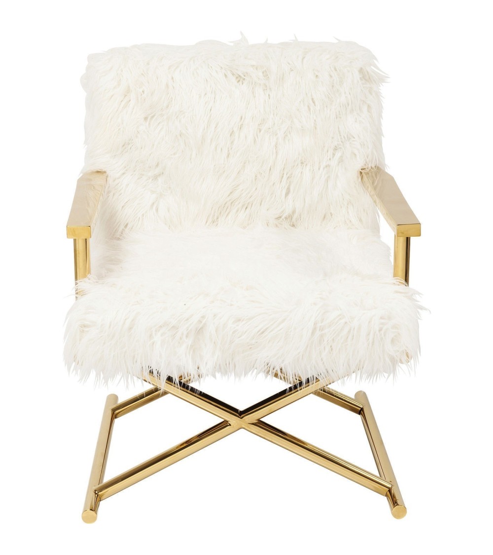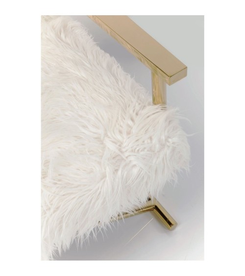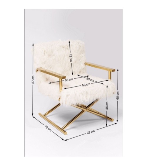 Ce fauteuil est composé d'une assise en polyester qui imite la fourrure et d'un piètement croisé en acier laqué. Son assise blanche douce comme une peluche offre un contraste élégant avec ses pieds dorés alliant confort et esthétique raffinée. Peut supporter jusqu'à 150 kg. Hauteur d'assise : 49 cm. Livré monté. Entretien : enlevez les miettes et la poussière avec une brosse douce ou l'aspirateur. Vérifiez que votre produit de nettoyage ne décolore pas le tissu en l'essayant d'abord sur une zone non visible (par exemple sous l'assise).