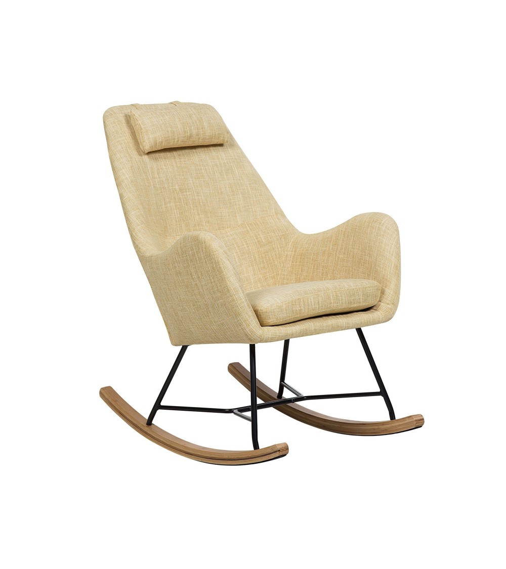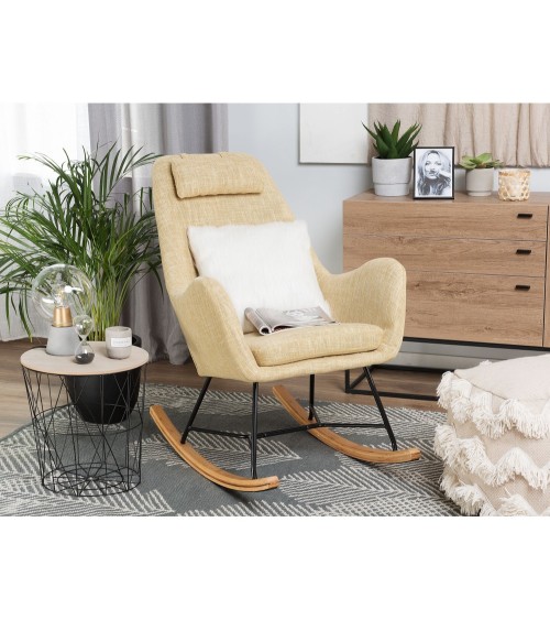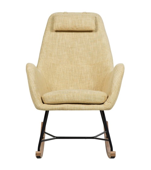 Cette chaise à bascule est une réinterprétation moderne du Rocking chair classique. La courbe du dossier et les accoudoirs de la chaise sont parfaitement incurvés comme dans un véritable fauteuil et le bercement assure un confort d'assise ultime. Revêtue d'un tissu durable de couleur jaune très chic, elle apportera une touche rétro dans vos décors. La chaise est adaptable à tout lieu, appropriée tant pour un coin lecture qu'à une salle à manger ou le salon. Partout où elle se trouve elle garanti une expérience de relaxation unique et fait la joie de toute la famille.
