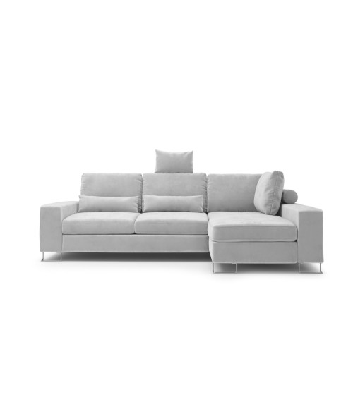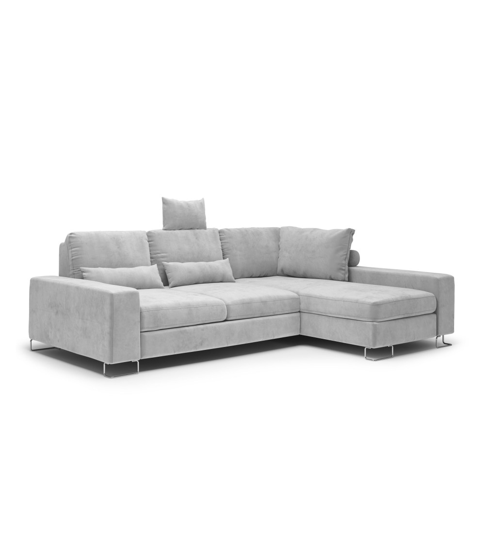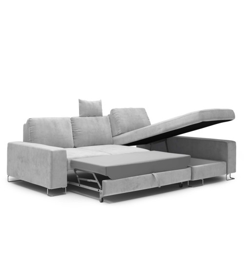 Magnifique canapé-lit d'angle polyvalent, Opal a été conçu pour répondre aux besoins des familles modernes. Très généreuse, sa taille est parfaite pour des soirées à la maison et vous pouvez facilement le transformer en un lit confortable pour vos invités qui restent dormir. Opal dispose également d'un grand espace de rangement intégré ! Les dossiers, appuis-tête et coussins sont mobiles et confortables. Le revêtement en velours, disponible dans la couleur de votre choix, est facile à nettoyer, durable et pratique. Ce canapé est soutenu par un ensemble de pieds métalliques argentés, délicats mais robustes, qui créent un effet presque flottant.