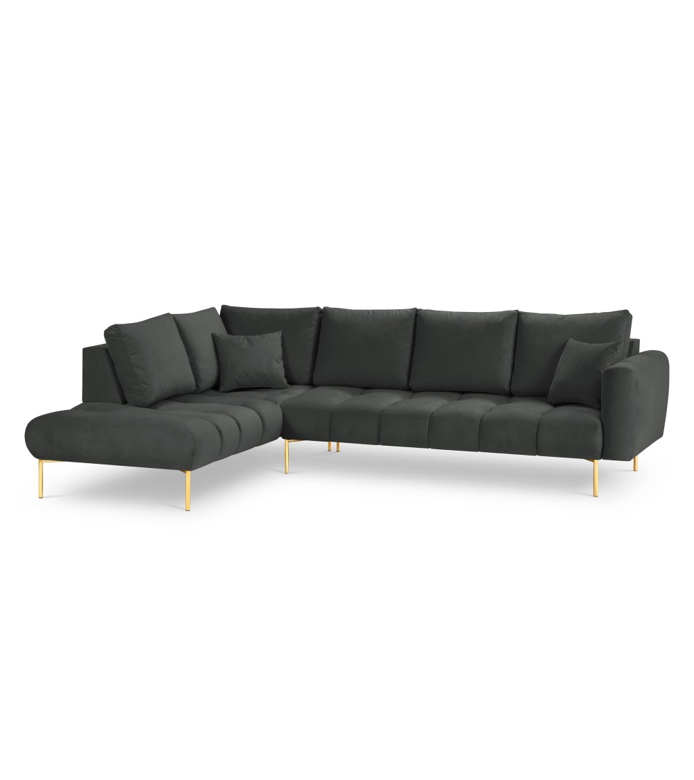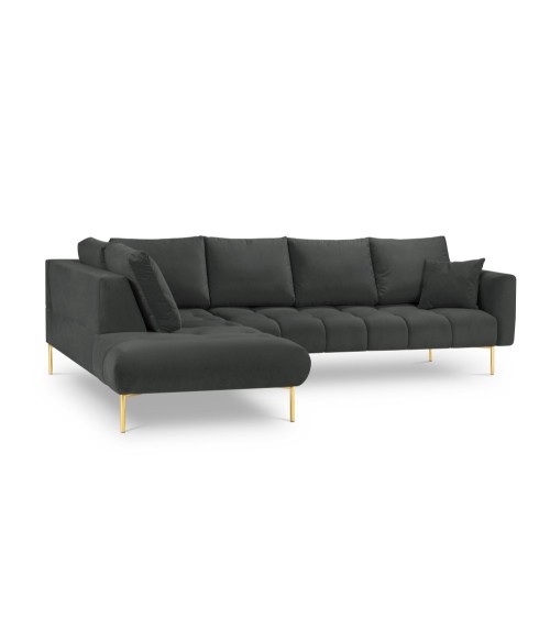 Le canapé d'angle Malvin crée une atmosphère chaleureuse et élégante au sein de votre intérieur ! Confortable et accueillant, ce canapé est doté d'un siège touffeté et de grands coussins en peluche pour le dossier et les côtés. Détente assurée. Son revêtement en velours lui donne un look exceptionnel tandis que ses pieds métalliques arrondis noirs ou dorés qui surélèvent le canapé au-dessus du sol le rend pratique puisqu'il devient facile de passer l'aspirateur.