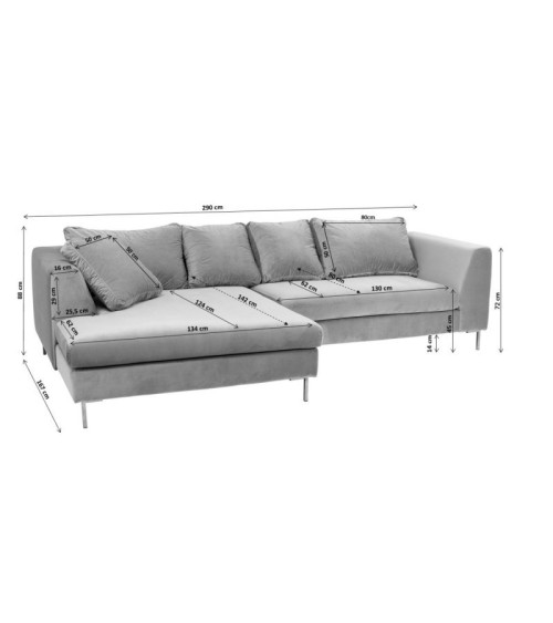 La gamme Gianna vous propose un large éventail de canapés d'angle en velours ou en tissu. Gris, vert, crème, marron avec des pieds chromés, noir ou acier brut : à vous de trouver le modèle qui vous convient. Vous avez également le choix entre l'angle à droite ou à gauche. La position de l'angle indiquée dans le titre du produit est celle quand vous êtes en face du canapé. Fourni avec 5 coussins. Capacité de charge maximale : 480 kg. Hauteur d'assise : 44 cm. Livré partiellement démonté. Fabriqué en Europe. Entretien : enlevez les miettes et la poussière avec une brosse douce ou l'aspirateur. Vérifiez que votre produit de nettoyage ne décolore pas le tissu en l'essayant d'abord sur une zone non visible (par exemple sous l'assise). Vous pouvez commander un échantillon de tissu pour vous rendre compte de la couleur et de la matière.