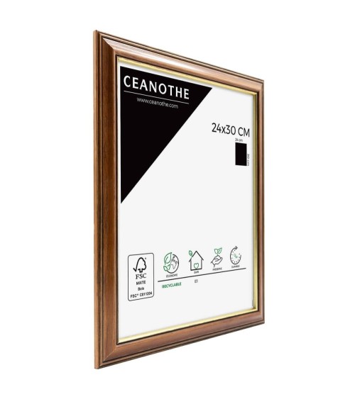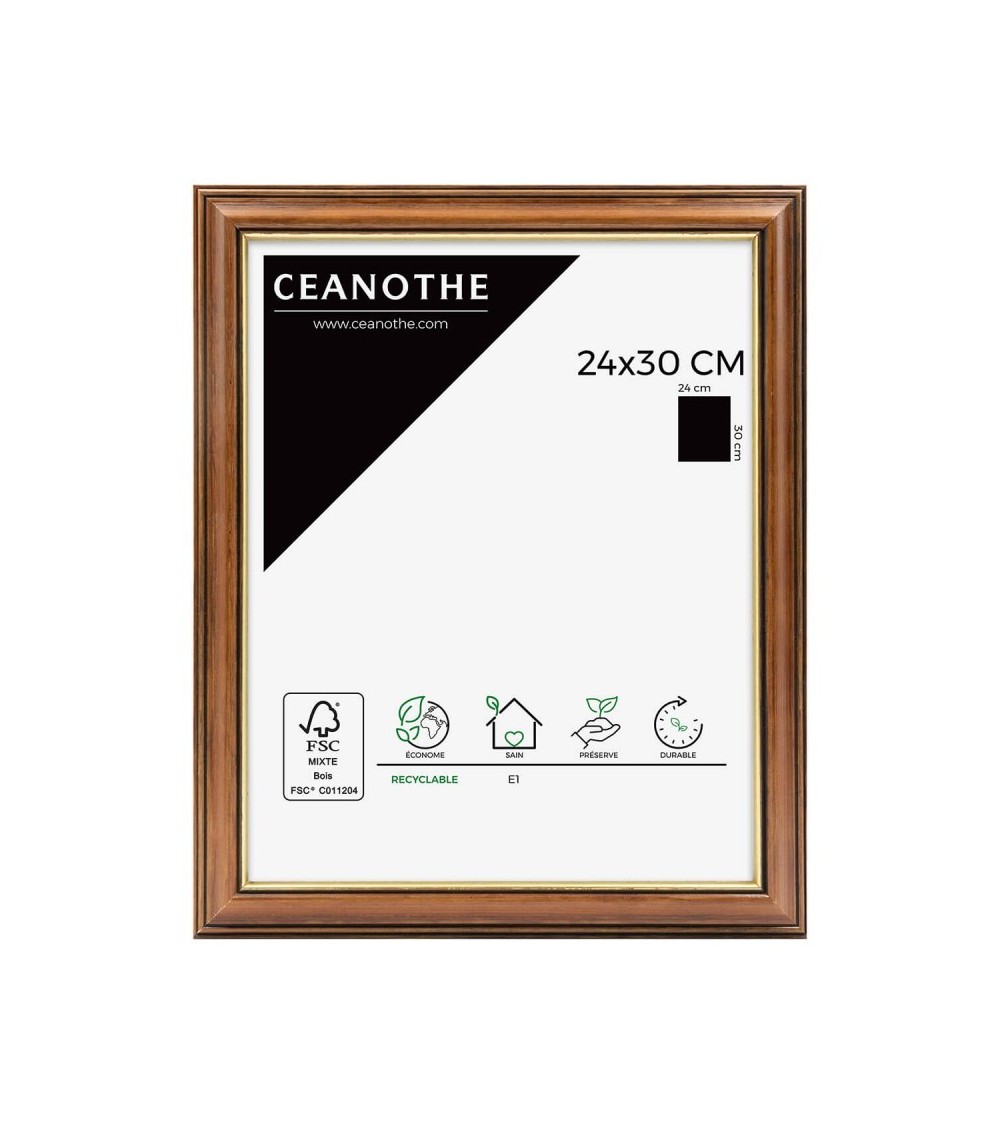Protégez et mettez en avant toutes vos photos grâce au cadre Bois et doré Vénézia et son verre minéral. Ce cadre photo format 24x30 cm est idéal pour mettre en avant des photos, posters ou affiches grand format de 24x30 cm. Ajoutez un passe.partout pour protéger et mettre en avant dautres formats de photos et posters avec ce cadre.La couleur du bois de ce cadre est classique et indémodable. Elle fait ressortir toutes vos plus belles uvres et photos tout en apportant une touche luxe et élégant à votre intérieur avec son liseré doré. Cadre Home déco facile à accrocher, il trouvera naturellement sa place dans toutes les pièces de la maison - hall dentrée, salon, chambres à coucher. Le cadre sublimera facilement un grand nombre de photos avec une touche déco très tendance, tout en raffinement. Ce cadre photo bois 24x30 cm est en bois naturel, un matériau solide, nature et esthétique. Ses dimensions extérieures sont 345x285x12 mm et se compose de 4 baguettes travaillées avec un liseré doré qui lui apporte de lélégance. Il apportera de la profondeur à vos photos avec un rendu design très qualitatif. Les finitions de ce cadre sont soignées. La couleur de cette gamme Vénézia fait de ce cadre une valeur sûre que vous garderez longtemps. Fabriqués en France et dans le respect de lenvironnement, tous les cadres de la collection Vénézia sont confectionnés à partir de bois naturel de pin certifié FSC. Parfait pour la décoration, il est léger et 100 pour cent recyclable.Depuis 1975, Ceanothe perfectionne au quotidien son savoir.faire et expertise sur lencadrement, la mise en valeur photographique et la décoration murale. Une société française engagée dans une démarche éco.responsable.