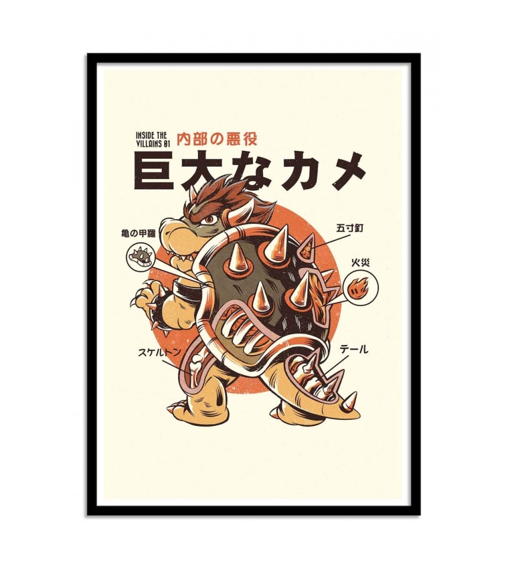 LES AFFICHES - Nos affiches sont imprimées en France, ou Union Européenne.Papier issu de forêts certifiées FSC.Affiche imprimée sur papier couché mat 250g, Haute Définition.Pour les formats d'affiches 30x40 cm - contient des marges blanches de 1,5 cm.Pour les formats d'affiches 50x70 cm - contient des marges blanches de 2 cm.OPTION CADRES - Nos cadres en bois sont fabriqués en France.Comprend une vitre en verre acrylique.Dimensions des cadres en bois 30x40 cm - Epaisseur du cadre - 15 mm, Profondeur du cadre - 20 mmDimensions des cadres en bois 50x70 cm - Epaisseur du cadre - 15 mm. Profondeur du cadre - 20 mm. L'artiste Ilustrata rend hommage à la culture nipponne qui est fascinante de par son esthétisme ! Sur ce poster, voici la célèbre créature Bowser, petit monstre du jeu vidéo Super Mario ! Dragon, tortue ou dinosaure ? Son anatomie atypique hybride nous fascine tous ! Cette affiche d'art fera battre le cur des gameurs, fans de la culture geek et amoureux du Japon ! Une décoration d'intérieur qui nous rappelle que notre enfant intérieur vit toujours en nous