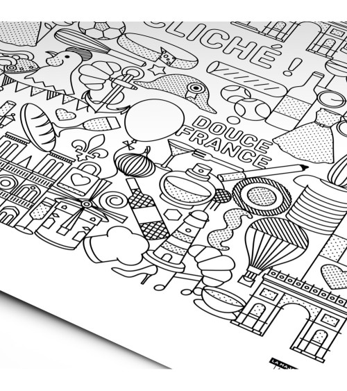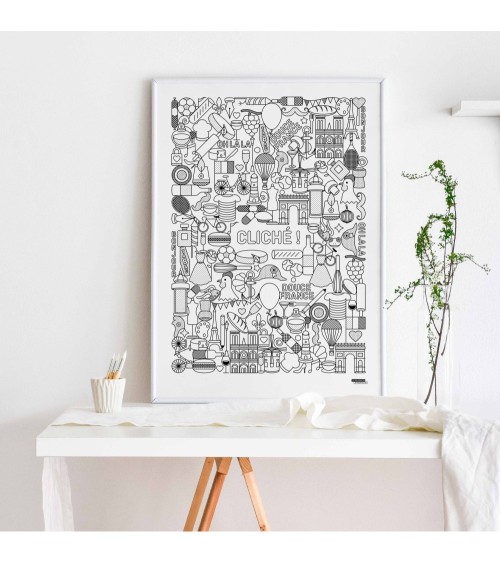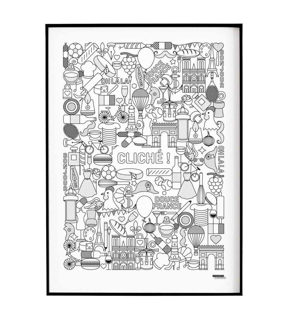 Une affiche noire et blanche qui explore graphiquement les jolis clichés et jolies choses qui font la réputation de la France. Minimaliste et ludique, elle invite à retrouver sa madeleine de Proust. A colorier ou pas. * Format 50 X 70 cm* Imprimée sur du papier mat 200g haute qualité* Expédiée seule (compatible avec encadrement standard)* 100 pour cent Made in FranceLa Majorette à Moustache, c'est une collection d'affiches et de cartes postales dédiées à la culture française.Éducatifs, graphiques et humoristiques, nos produits revisitent de nombreux thèmes pour (re)découvrir notre beau pays- foot, vignobles, architecture, ou encore les icones mythiques de la chanson française.Avec ses valeurs, La Majorette décline une gamme haute en couleur, richement illustrée et au design graphique soigné. N'hésitez plus, affichez sur vos murs votre amour de la Pop Culture FR !