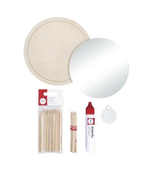 Créer vous.même un miroir vintage en forme de soleil de ø 32 cm!Ces miroirs, habituellement connus en rotin ou en osier, se vendent souvent en brocante.Désormais, vous pourrez le fabriquer vous.même avec cet ensemble complet DIY.Pour cela, il suffit de fixer le miroir au centre du rond en bois avec de la colle.Fixez ensuite tous les bâtonnets avec la colle fournie, pour obtenir le miroir soleil.Le miroir pourra s'accrocher facilement grâce à un petit système de suspension fournit.Le miroir mesure 15 cm de diamètre.Une fois terminé, le miroir mesure 32 cm de diamètre avec les bâtons collés.Le kit contient - un socle en bois pour coller le miroir, un miroir de ø 15 cm, 64 bâtonnets de 10 cm, un tube de colle ainsi un petit système d'accroche.Il ne vous restera plus qu'à le bomber avec de la couleur, à le peindre ou à le laisser brut pour un effet naturel.