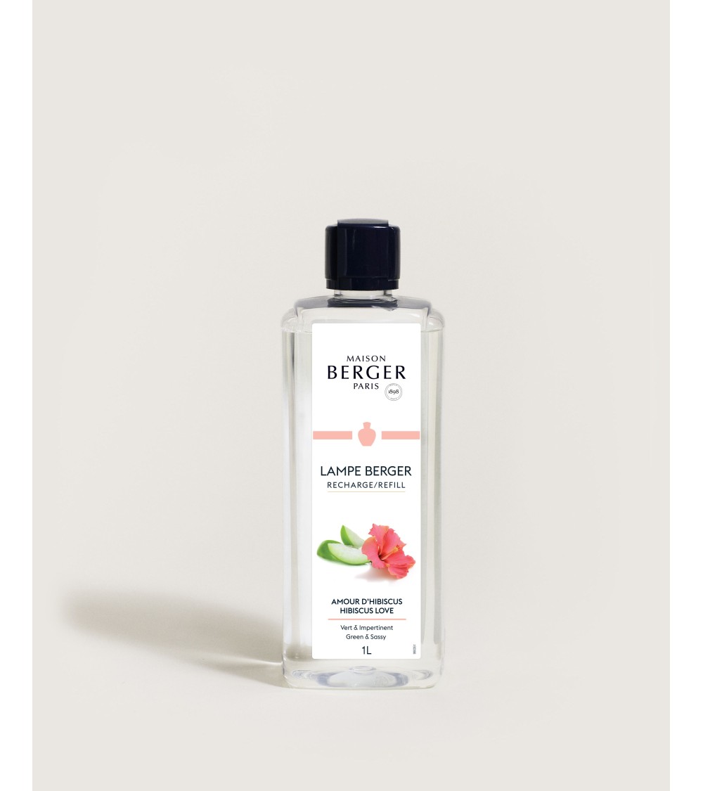 La recharge parfumée Lampe Berger Amour d'Hibiscus délivre d'odorants arômes d'Hibiscus, mais aussi de Pomme et de Musc. Cette fragrance très fleurie, naturelle et féminine, vous offre une balade olfactive d'une rare intensité. Cette recharge est parfaite si vous souhaitez un voile d'intérieur aux senteurs fleuries. Disponible aussi en format 1 litre.Gestuelle -Depuis 1898, la Lampe Berger est entrée dans le quotidien des français. Destinée au départ à purifier l'air en neutralisant les odeurs, elle fut transformée en objet décoratif et parfumant dans l'entre.deux.guerres, investissant progressivement la sphère privée. Sa double action est aujourd'hui très appréciée.Parfum -Élaborés par les maîtres.parfumeurs grassois en collaboration avec le service recherche et développement de la marque, chaque parfum Maison Berger Paris est unique. Une large offre de fragrances est disponible.L'exigence est à son plus haut niveau concernant la qualité des produits proposés, les substances diffusées sont régulièrement contrôlées par des laboratoires indépendants. C'est la garantie pour vous de l'absence de fumées et de polluants dans l'air.Conseils d'utilisation -Le brûleur pour Lampe Berger doit être changé tous les 200 allumages ou tous les ans.Adaptez l'intensité de votre parfum en le diluant avec le parfum de maison Air Pur