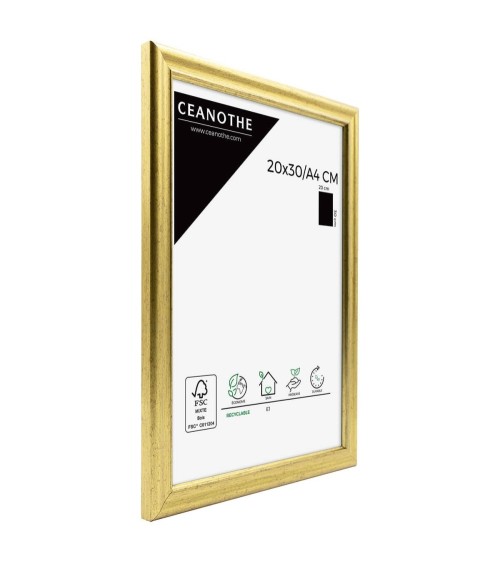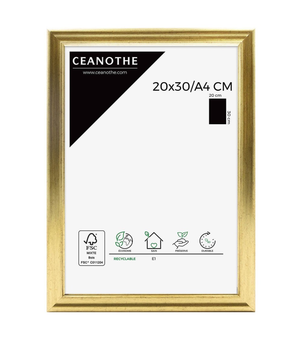 Protégez et mettez en avant toutes vos photos grâce au cadre Doré Circée et son verre minéral. Ce cadre photo format 20x30 cm est idéal pour mettre en avant des photos, posters ou affiches grand format de 20x30 cm. Ajoutez un passe.partout pour protéger et mettre en avant dautres formats de photos et posters avec ce cadre. La couleur Doré de ce cadre est simple et indémodable. Elle fait ressortir toutes vos plus belles uvres et photos tout en apportant une touche luxe et élégant à votre intérieur. Cadre Home déco facile à accrocher, il trouvera naturellement sa place dans toutes les pièces de la maison - hall dentrée, salon, chambres à coucher. Le cadre sublimera facilement un grand nombre de photos avec une touche déco classique et raffinée. Ce cadre photo Doré $30x20 cm est en résine recyclée, un matériau solide, nature et esthétique. Ses dimensions extérieures sont 33.1x23.1x1.8 cm et se compose de 4 baguettes travaillées. Il apportera de la profondeur à vos photos avec un rendu design très qualitatif. Les finitions de ce cadre sont soignées. La couleur de cette gamme Circée fait de ce cadre une valeur sûre que vous garderez longtemps. Fabriqués dans le respect de lenvironnement, tous les cadres de la collection Circée sont confectionnés en résine recyclée. Parfait pour la décoration, il est léger et 100 pour cent recyclable. Depuis 1975, Ceanothe perfectionne au quotidien son savoir.faire et expertise sur lencadrement, la mise en valeur photographique et la décoration murale. Une société française engagée dans une démarche éco.responsable.