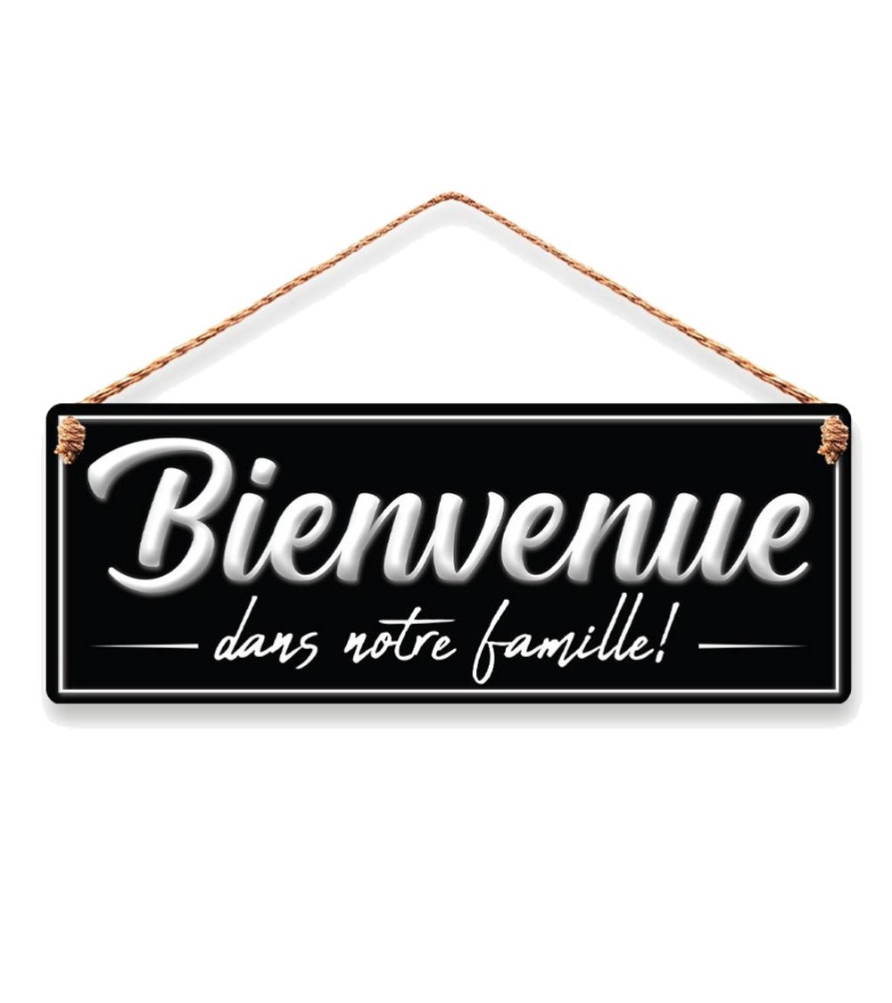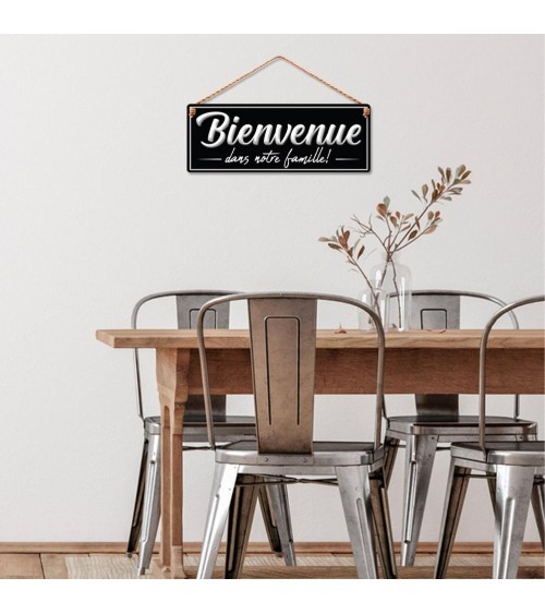 Plaque à suspendre relief . Bienvenue 40 cm Matière Métal et corde Dimensions - Hauteur 15 cm . Largeur 40 cm . Profondeur 1 cm Couleur bois, blanc et noir. Mots en relief