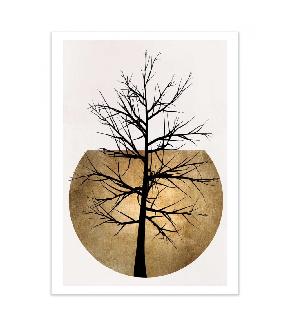 LES AFFICHES - Nos affiches sont imprimées en France, ou Union Européenne.Papier issu de forêts certifiées FSC.Affiche imprimée sur papier couché mat 250g, Haute Définition.Pour les formats d'affiches 30x40 cm - contient des marges blanches de 1,5 cm.Pour les formats d'affiches 50x70 cm - contient des marges blanches de 2 cm.OPTION CADRES - Nos cadres en bois sont fabriqués en France.Comprend une vitre en verre acrylique.Dimensions des cadres en bois 30x40 cm - Epaisseur du cadre - 15 mm, Profondeur du cadre - 20 mmDimensions des cadres en bois 50x70 cm - Epaisseur du cadre - 15 mm. Profondeur du cadre - 20 mm. Affiche d?art d?un arbre dore . Kubistika illustre des compositions surrealistes, en utilisant des plantes, des oiseaux, sur fond de montagnes et couchers de soleil...