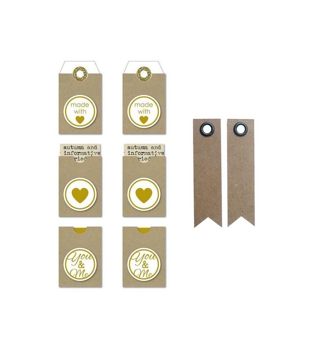 Comment indiquer au destinataire du cadeau que vous en êtes l'auteur ?Avec ces étiquettes kraft à cadeau, laissez.lui votre nom et un message !2 étiquettes Made with love, 2 étiquettes cur et 2 étiquettes You & me, soit 6 étiquettes kraft perforées.Dimensions - 3,2 x 5,3 cm 20 étiquettes kraft en forme de fanion, dimension 5 x 1,2 cm.A utiliser pour le scrapbooking, la décoration d'intérieur, pour compléter le service de table d'un mariage.Ces étiquettes comprennent un trou avec un illet marron foncé pour y faire passer une ficelle.
