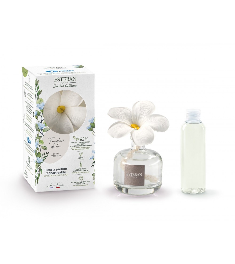 Diffusion à froid permanente, parfum aux extraits naturels* et Vegan. Fleur décorative 100 pour cent fait main Mèche 100 pour cent coton Pétales d'origine végétaleUn parfum floral musqué C'est la sensation du linge propre, où les notes vertes et florales se lient à la douceur de muscs.. Notes de tête- Petitgrain, citronNote de cur- Fleur doranger, rose, jasminNotes de fond- Muscs blancs